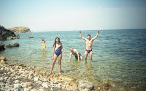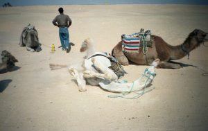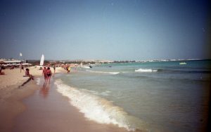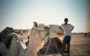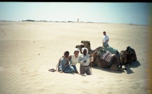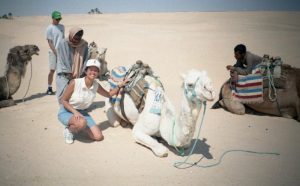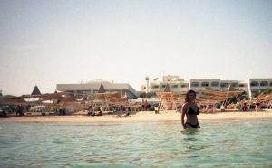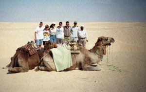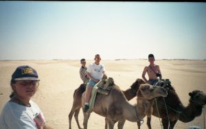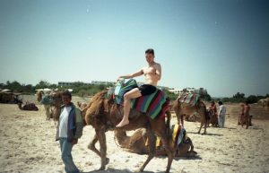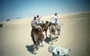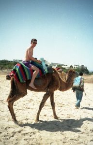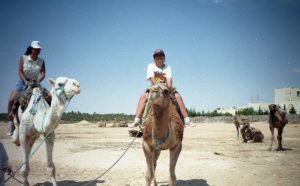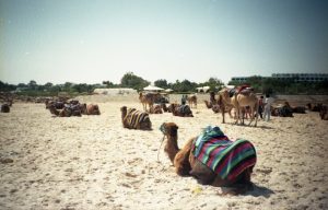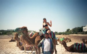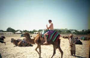 9 June: A relaxing day today…what a relief! Today I awoke at about 6:20 am, and obviously Sean slept in too, as we didn’t go running. I got ready for school, dreading the yogurt to come. Fortunately, we had bread with butter and salami instead. It was good. A 100x improvement. Sean and I arrived at school and found we had a lecture that morning. Inshallah! Praise God! We listened to a speech about Tunisia and its history. It was very interesting. Then we sat around and waited for MAJ Keith to return and take us to Hammamet, the tourist resort. We finally left about 11:40 am, to cross the road for lunch. It was OK, but I am beginning to see the difference in Noora’s food and everyone else’s. Sean had diarrhea. We all laughed but MAJ Keith bought him some Imodium tablets…taking care of his troops! We drove out to Hammamet. I listened to my Walkman the whole way and took a snooze. I awoke as we arrived in a hotel resort area. The women were topless! Of course all the guys pointed that out to me. They told me I had to blend in, therefore I needed to take my top off! So I told them fat chance – this was going to be one gal that stood out. Anyway, as we approached the beach, there was a whole yard full of camels. I knew it was a scam from minute one but wanted a picture no matter what. So we all changed and went swimming. It was cold. The Mediterranean is pretty though. I got out and was sunbathing for a while. The guys were staring at everyone. Finally, I convinced Sean and Pad to come “look” at the camels with me. Of course I rode it while Pad took photos and despite their adamant claims that *they* would not get suckered, all 3 of us clambered up onto the camel’s back and went for a ride. It was fun…but what a rip off. 17.5 bucks! Oh well, once in a lifetime deal, ha. Anyway, we swam some more and I went for a walk. I was soon stopped by an over-eager Arab who wanted to take me to the disco. He pointed to my 5 male companions and asked if they were my boyfriends? I told him no, but showed my ring finger and said “Ana muta zouwij” (I am married). That took care of business. We stayed till 5 pm and drove home. An hour later, I ran into the house and took a refreshing hot water bath. It sure felt great. Then we ate dinner. After dinner, we looked at photo albums and I learned more about Mohammad and Foouzia’s family. Overall it was a very nice day.