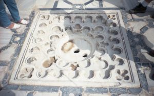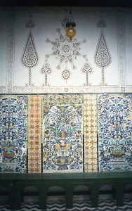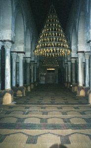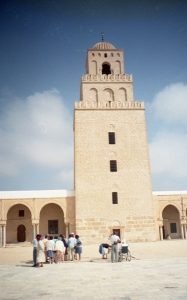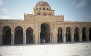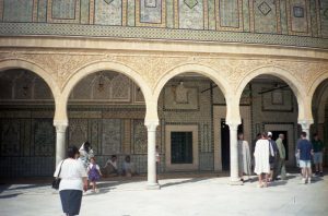 My trip to the Mosque (in detail): We walked into an area similar to the one in Kairouan with the fountain in the middle of the room. But for some reason, it was under construction and half of it was taped off. So Foouzia and I entered a dark room that was lit by candles. There were several old women lying down, and one sitting right outside the mosque’s entrance to the shrine. We walked in and Foouzia pushed me (motioning for me to remove my shoes), so I quickly removed my sandals and followed her. The inside of the mosque was very pretty. There was a large dome built entirely out of gorgeous tile work. The Koran’s scriptures began at a 180 degree direction of the shrine itself, and green was the predominate color. A woman sat inside the shrine’s gate and as she approached us, Foouzia hit me and made me chant the chants she was muttering. The woman finally left and we sat on these thin straw mats that were spread out on the floor. I mimicked every movement of Foouzia to the T. I felt like a monkey, playing copycat or follow the leader. But we finally got done with the prayer and stood up. Foouzia took me to a tomb that was inside the mosque and it was surrounded by a wooden fence. We peeked inside and saw some memorabilia. Then we walked back to the shrine and I gave the woman that overseeing everything a Dinar for an “offering”. Finally, we bowed and left. Right outside sat a bowl of water which we both took sips from. It was all such an interesting experience.