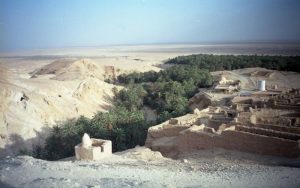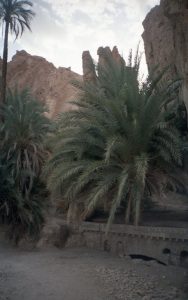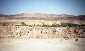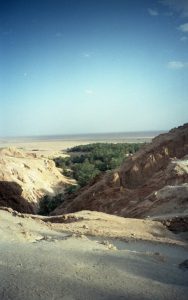 10 June: What a long day! I am so tired right now. It was the most tedious and yet the most fulfilling day too. We started our weekend trek down south. It is absolutely incredible here. We awoke at 5 am to get ready to pick Pad and Ryan up at 5:30 am. We drove south from Tunis towards the city of Kairouan. First stop was at the Prophet Mohammad’s barber’s burial place, Sidi Sahab. We learned that Sidi Sahab saved 2 of Mohammad’s beard hairs, which he carried with him everywhere he went. There were also two large 9th century cisterns holding pools of water (Aghlabid basins). After that, we visited the nearby Great Mosque of Kairouan. It was neat. I’ve never had the chance to see one before, so it was all new to me. I had to wear a white robe as my shorts didn’t cover my knees. As non-Muslims, we weren’t allowed to enter the mosque’s prayer hall, but we were able to take photos from the outside looking in. Afterwards, we went to the Mosque of the Barber (also called the Zaouia of Sidi Sahab), which had incredible ceramic and tile work. It was magnificent! Foouzia bought me a necklace there. We then hopped back into the land rovers and traveled an hour to Sbeitla (the best preserved Forum Temples in all of Tunisia). After some time to explore, it was back in the vehicles where of course I fell asleep. When I awoke, we had arrived to a town where we took a break for lunch. The Tunisian drivers here are crazy! Good thing I was sleeping. I guess our driver almost had a head on collision with another driver! Anyway, lunch was OK – nothing spectacular. The Tunisians love to eat lamb – I’ve never eaten so much lamb before. We then continued onward, arriving at a series of Oases. I had never seen an oasis before but it was magical to see vegetation in the middle of a desert! It is something dreams are made of. The view is simply indescribable. We drove past tons of sand. Good thing they are hardy and reliable cars. We simply flew! We saw a spectacular view of Mides Canyon cut away by years of water. Absolutely amazing! Then we started the magical part of the journey. We stopped to see the old abandoned city of Tamerza (abandoned after the floods of 1969). We were right on the Algerian border where religious fanatics recently killed 7 or 9 young men. Anyway, after more pictures, we traveled up this winding road with more coils than a snake, twisting and winding our way up to the mountain. I guess the military has men that extend the road out width wise. There was a small delay while we waited for a nervous farmer to move his tractor and broken down trailer out of the road. In the meantime, about 5 land rovers accumulated, honking their horns with impatience at the delay. We finally got moving again and flew up and down, in and out of the winding road. The feeling is absolutely indescribable – you see palm trees that exist only in movies. It all seems so unreal! We drove toward a remote oasis village, listening to techno music the entire way. It was great. The village was small, and Bedouin folk refused to have their pictures taken. I took some gorgeous shots of the scenery though. It was so beautiful. I saw a gorgeous Bedouin girl with red hair, green eyes, and the tannest skin. What a combination! She smiled beautifully when she saw me staring at her unbelievable eyes. We all bought “dough” necklaces from the Bedouin girls atop the mountain. It was a day to remember! Afterwards, we drove towards the oasis village of Tozeur where our hotel was and showered real quick. Afterwards, we ate a nice meal and I played cards with Sean for a while. The boys went out, so I decided to sleep and get up early for a swim in the morning. Today was an absolutely wonderful day!!!