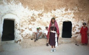11 June: Although it is surprisingly the driving that wears me out, I wish the days here were endless. Another great day! We awoke at 5:30 am, swam at 6 and I admired the mosque’s dome as the sun beat down on Ameera and me. We dressed, got ready for the day and at a buffet style breakfast in Tozeur. It was surprisingly good. I finally had a chance to mail off my letters. We then drove right down the street and went into a restored mansion that has been converted into a museum (Dar Cherait). All of us paid for the 1001 Arabian Nights experience which was pretty cool. There were lots of wax figurines dressed in traditional Tunisian outfits. Needless to say, I took a ton of photos. My favorite was one of me next to the guards and this 8+ foot tall giant! After Dar Cherait, we all piled into the land rover again. Foouzia has promised me a 1st class robe from Morocco. I can’t wait. There are so many gifts I want to give. From spices to rugs to swords and lamps to scarves…everything! We picked up the driver’s brother, and then drove onward forever. We went through a desert and ended up in a town with a hotel. We ate buffet style at the restaurant, and met about 20 to 30 Americans there! They were all in the Navy (Seabees, construction workers). It felt weird, not being the only Americans. We then rode camels, which was awesome! We paid 5 Dinar for 30 to 45 minutes and it was worth it. I had a blast. The camels were kinda ugly, but beautiful at the same time. I rode on a white camel, which was the only one. Then we drove forever. For hours it seemed like. We were on a crazy road, which ended abruptly. Then we went cross-country, forging new roads! We ended up at a city called Matmata, with houses built into the earth. I was dressed up in traditional garb. It was fun. When we ended up reaching our hotel for the night, it was amazing!!! A cave like city, the rooms are simple but it is soooo quaint. I love it here. For dinner we ate a traditional meal of couscous followed by watermelon for dessert. We stayed up late talking for a while and met an American. He speaks Arabic really well…I was impressed! We had the CD player blasting some American music and eventually called it a night. What a day.