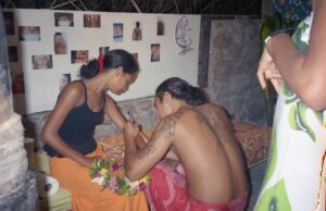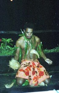 The drama and pageantry of a Tahitian wedding ceremony is unforgettable. Upon arrival at Tiki Village, Becky was immediately separated from Robby and brought to the “women’s only” section of the village. Meanwhile, Robby was escorted by several Tahitian men to the “men’s only” area where he was stripped naked (in full view of Becky’s family of course!) and rubbed down with oil and dressed in a white pareu.