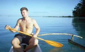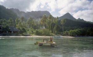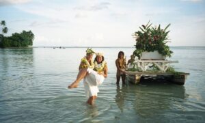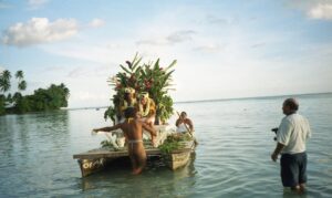 After this ritual was complete, Becky was bedecked in white pareus, topped with a massive shelled necklace and feather crown. Once she emerged from the hut, the Tahitian warrior standing guard at the front entrance raised his conch shell and bellowed her arrival to the awaiting audience on the beach front. Robby was awaiting his future bride on a boat. Before the Tahitian men rowed him back to shore, they urged Robby to yell Tahitian phrases at the top of his lungs. He had absolutely no idea what he was saying and they kept laughing at his attempts to mimic the Tahitian phrases.