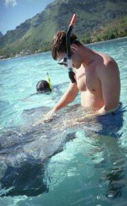 Every morning, we’d leisurely wake up and have breakfast, hop in a boat for a short ride towards shore, and drive towards Moorea’s Beachcomber Resort for a session of diving. Diving in Tahiti is absolutely amazing. We fell in love with the warm waters, fascinating sea-life, and friendly dive-masters. We have been all around the world diving, but our underwater experiences in Tahiti rate as one of the top. Especially the shark feeding dives! Imagine your blood pumping furiously at the sight of 12 foot long lemon sharks feeding just beyond your grasp…lemon sharks are absolutely massive as they can easily dwarf a human being. Such graceful, magnificent creatures, the lemon sharks never failed to thrill. We never wanted our diving experiences to end, so whenever we weren’t diving, we were snorkeling around the length of our island. Puffer fish, turtles, star fish, trigger fish, and sting rays were just a few of the marine life that we would see on a routine basis right around our island!