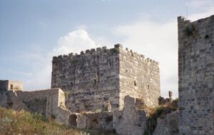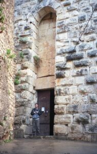 Robby beneath the entrance to the crusader castle at Salah Ed-Din, one of the very few castles not entrusted to the military orders of the Hospitaller or Templars