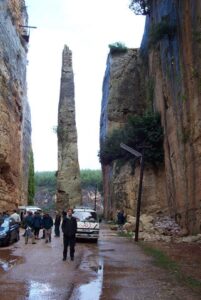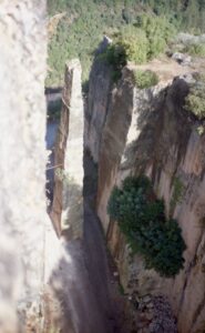 This hand carved 28m deep ditch was created by the Byzantines at the Citadel of Salah Ed-Din (Qal'at Salah al-Din). The needle tower behind Becky supported a drawbridge into the crusader castle