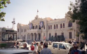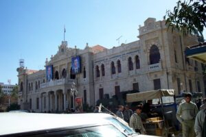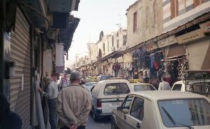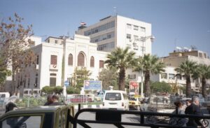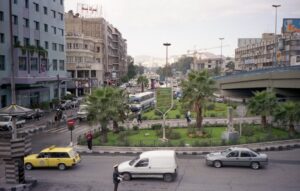 Busy street scene in front of the Al Hejaz railway station in Damascus