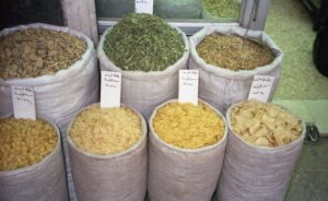 Pasta, grains, herbs and beans for sale; Al-Hamidiyah Souq