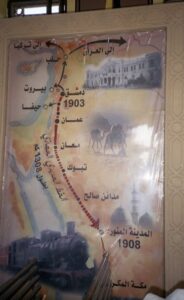Map showcasing the ambitious plan of the Ottoman Railway, which was to link Istanbul (Turkey) to Mecca (Saudi Arabia) via Damascus (Syria). The railway only got as far as Medina because the project was abandoned during WWI; Al Hejaz railway station in Damascus