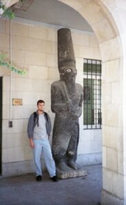 Robby poses next to an Assyrian statue at the National Museum entrance; Damascus