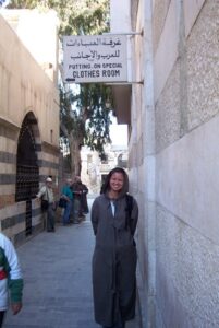 Becky at the "Putting on special clothes room" where she donned a robe to cover up, Umayyad Mosque (Great Mosque of Damascus)