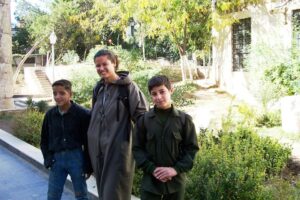 Two Syrian boys get a kick out of seeing Becky covered up at the Umayyad Mosque, Damascus