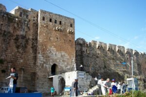 The next day we drove to Latakia via Krak des Chevaliers & Saladin’s Castle. The morning’s drive brought us to the formidable Krak des Chevaliers AKA the best-preserved Crusader Castle in the Middle East. With its dramatic setting atop Jebel Khalil, the impregnable turrets and towers stand as a defiant reminder of the holy crusades against the forces of Islam by Christian knights from northern Europe, who established the Latin Kingdom of Jerusalem (1100-1290). We admired the multi-layered fortifications, long dark passages and inner galleries and chambers at the heart of the fortress. After a delicious lunch of chicken and lamb sandwiches and fries, we drove along the coast to Latakia, Syria’s main port. The Greek leader, Seleucus I, named the city Laodicea 2,200 years ago. Afterwards, we visited Saladin’s Castle, one of the great crusader castles. Saladin’s castle offered commanding views of the surrounding landscape.