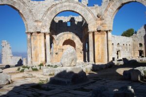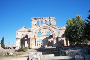 The next day was spent exploring the amazing city of Aleppo. On the trading routes with Europe, the Middle East and Asia, Aleppo grew and flourished ever since the third millennium BC. Following its Greco-Roman plan, the vaulted bazaar winds through an amazing 15km of passages with beautiful adjacent caravanserai. A particularly fine example is the Khan al-Wazir whose archway is formed of elegant traditional black and white alternate bands of stone. The windows are carved with delicate geometric designs and pale stalactite decorations hang above the windows. We took advantage of our half-day tour to explore the mighty citadel, whose awesome walls dominate the city and resisted many fierce attacks. Surrounding the citadel are a ditch and a steep glacis or bank of stones around the base preventing the enemy from sustaining any direct hold on the bottom of the walls. 40 rectangular towers crown the battlements. At the citadel, the scorching sun beat down relentlessly upon us. When we ended the citadel tour, we gratefully sought refuge at a nearby restaurant for lunch and a chance to cool down. Later that afternoon, we drove to the monastery of St Simeon, where a strange mystic and holy man spent 42 years of his life chained to the top of a column, advising emperors and commoners to mend their ways. After his death, a beautiful church was built around the sacred column. The views from St. Simeon’s church were amazing and well worth the trip.