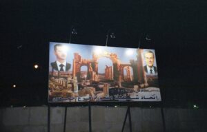 Night shot of a billboard showcasing President Bashar al-Assad along with his father Hafez al-Assad endorsing the ancient city of Palmyra