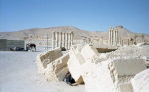 A local tries to find some shade under the massive ruins of Palmyra during the mid-day sun