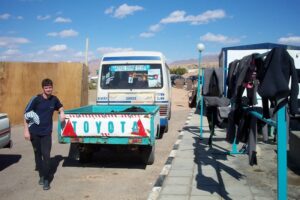 The commotion we caused on the shore was really amusing. The locals who were relaxing on the beach smoking flavored tobacco from water pipers were intently checking us out. So were the women who were wading into the red sea wearing black chador style bathing suits….yes, Becky was ogling them back since she couldn’t imagine having to swim that way! You can imagine the look on their faces when Becky sauntered into the sea carrying her own gear and looking just like one of the guys….because of all the attention we were getting, we believe that very few tourists venture here as we felt like we were a novelty item for the locals to gawk at. The young children were very curious about us and when we waded back out after an hour long dive, they surrounded us to study how we dismantled our gear and loaded up the van.