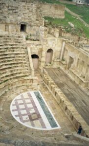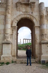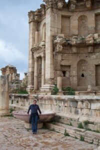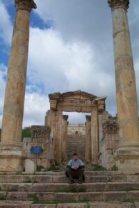 Today we drove to Jerash to explore its Graeco Roman ruins. We had made a futile attempt yesterday afternoon to visit the site but it was closed. Therefore, it was an early day for all of us as we had a lot to accomplish today. Jerash is located in the Gilead Hills and is considered to be the best preserved cit of the Roman Decapolis (a confederation of 10 Roman cities). It has the reputation of being one of the top Middle Eastern sights, with a triple arched gateway leading to a colonnaded street, temples, baths and theaters. And amazingly, we had the entire area to ourselves. Our group gathered to take our group photo shot and once the pictures were developed, we marveled at how there is literally no one else around in the background. Needless to say, the threat of war was already taking its toll on Jordan.