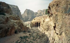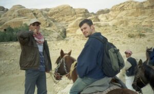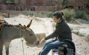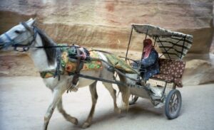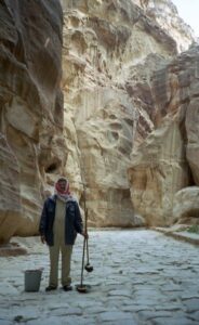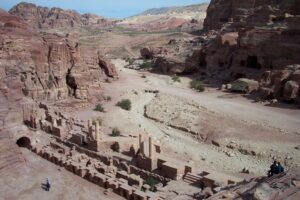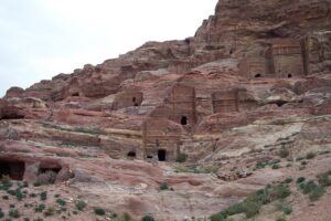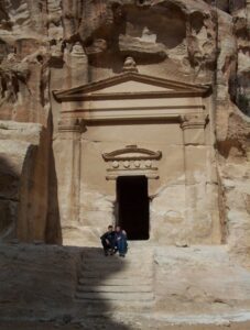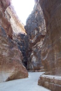 The next morning, we had a walking tour of Petra (Petra means “rock” in Greek). Petra, the ruined capital of the Nabataeans, (Arabs who dominated the area in pre-Roman times), was forgotten about for hundreds of years. It was rediscovered in 1812 and excavations started in 1929, and the current city was not discovered until 1958! To get to Petra, we had to endure the long siq again. However, several bright entrepreneurs have decided to capitalize on the Indiana Jones experience by renting out their horses for a brief (and WILD) gallop down a section of the siq. Our entire group agreed and we naively mounted our horses with no idea of what was in store for us. We think the young men got a kick at seeing us bouncing all over the place…after our crazy horse-back riding experience, we definitely empathize with Harrison Ford during the scene where he is furiously galloping down the siq at break neck speed. That was no joke and we gratefully dismounted from the horses to walk the rest of the distance towards the treasury.