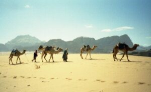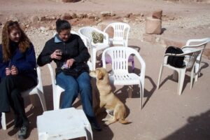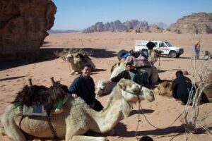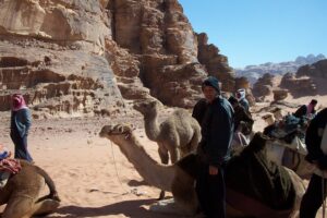 For lunch, we camped out on a blanket in the sand and chowed on our simple picnic. We were about to partake in a 3 hour camel ride and we could hear the camels from afar. They were groaning and moaning in the distance and we all eyeballed the bunch and secretly chose our camels from amidst the rag tag group. There seemed to be more camels than there were tourists so we knew that the camel herders would be jostling to get us aboard one of their camels. Sure enough, when the dust settled and each one of us was on top of our feisty camels, there were several herders without passengers. Needless to say, they were extremely disgruntled and it took Mohannad’s smooth placating nature to appease them.