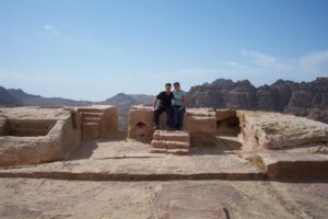 Little Petra was pretty neat, although we found it incomprehensible that some travelers would rather forego the hefty Petra entrance fee in lieu of the free (but much smaller) Little Petra. While we were waiting on our taxi for the return trip back to Petra, we drank mint tea with a local Bedouin family. When we were leaving, we gave their children some candy which they eagerly snatched from us….soon a fight ensued when the little girl’s brother stole her candy from her! It was heartbreaking to see the tough lifestyle that the Bedouins have to endure. Once we were back in Petra, we decided to hike up to the place of sacrifice (near the Siq…it’s a 30 minute climb to the top). From the top, we had phenomenal views of the entire Petra rock-hewn city as well as the Negev Desert. We decided to go back down another route, passing by the Lion Fountain, Garden Tomb, Tomb of the Roman soldier, the Triclinium and lastly, towards the Pharoan Column. Boy were our legs sore after hiking all around Petra! It was a really awesome experience and we wished we had even more time to explore here. However, we still had much more of Jordan to see.