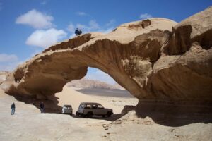 The next morning, we loaded up our gear into two 4WD jeeps for an excursion into the desert. We were on our way to Wadi Rum and our drivers decided to race each other in the desert. Our first stop was at an incredibly big natural rock “bridge/arch” that we all hastened to climb atop. The views across Wadi Rum were spectacular and it is no surprise why Lawrence of Arabia was filmed here. The massive sheer jebels that arise out of the desert make for some fantastic shots.