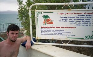 We left Aqaba and drove north towards the Dead sea, our next stop. When we finally arrived there, the sky was overcast and threatening to rain, but we all stripped down into our suits and jumped into the beckoning waters. The Dead sea truly lives up to its reputation. It lies surrounded by barren hills and has 33% salinity! Of course, no life can exist within the Dead sea, hence its name. We tried every conceivable position in an attempt to sink beneath the water but it was impossible. We had been forewarned not to let any water hit our eyes nor venture in if we had open wounds. And rightfully so since we could feel the tingling effects on our skin. While we were playing in the water, everyone rubbed oodles of Dead Sea mud all over their skin (they even sell it in the nearby boutiques but why buy mud when you can get it for free?). We soon were in need of a very serious scrub down so when the rain finally hit us, we rushed back up the shore to get cleaned up.