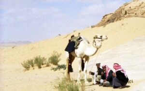 We were off on our journey through the dramatic Siq al Barrah. For the next three hours, we rode and walked through a landscape of sandstone mountains and white and pink colored sands. The desert truly is another world and has been inhabited by the nomadic Bedouin for centuries. This entire region is steeped with the Lawrence of Arabia legend, and we were advised to read up on Lawrence prior to the trip in order to appreciate everything to the fullest. If anyone ever tells you riding a camel is comfortable, they obviously have never done it for 3 hours. Our bums were killing us and even in the “camel sitting position” (one leg curled over the other), it was a rough ride. We were grateful for the first rest break where we all gathered to sit beside our camels in the sand and allow them a few minutes to relax.