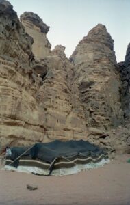 We finally reached our campsite for the evening and dismounted our camels. We were going to be camping out beneath the stars and moon in the desert, in a Bedouin style tent! We had about an hour to find a vantage point from which to watch the sun set so we scrambled about in search of that perfect location. As the sun crept below the horizon, the temperature was also dropping quickly. Once the sun set completely, we made our way to camp and set up our sleep sacks for the evening. Thankfully, one of the Bedouin guides had set up a camp fire, which we all gratefully gathered around. Dinner was served and we all enjoyed a scrumptious meal put together by our Bedouin hosts….tasty barbequed chicken and lamb, fresh tomato and cucumber salad, delicious humus and pita bread…collectively it was a wonderful treat that we did not hesitate to serve ourselves seconds.