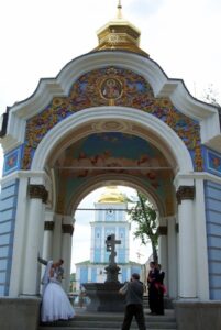 The next day we decided to visit the famous Kievo-Pecherska Lavra, which is a nine-hundred-year-old monastery. It is more commonly referred to as the Lavra Monastery, with the word “Lavra” considered an honorable title, bestowed only to monasteries of extra-size and special religious importance. Lavra monastery is an amazing complex since it houses two 11th Century cathedrals on its grounds, as well as its world famous underground catacombs, bell tower and museum collections. It is conveniently accessible via a short trolley ride from the center of town. We read that Lavra monastery was founded by several monks many centuries ago. These monks lived in caves that become known as the spiritual center of Ukraine. Even today, a visit to the complex is awe inspiring. It was super sunny when we visited and we were almost blinded by the light reflecting off the numerous golden domes sitting atop the complex’s many churches and belfries. Apparently, it is a miracle the monastery has survived throughout the years since time has attempted to ravage it. Amazingly, the monastery survived from numerous enemy attacks, devastating fires and other misfortunes relatively unscathed. Our favorite view was from the top of the belfry, overlooking Dormition Cathedral and the Dnieper River. Another cool experience was clambering through one of the catacombs. We bought candles at the entrance and descended deep into a maze link tunnel, stopping every so often to admire the frescoes painted on the walls as well as the intricately decorated tombs. The only drawback about the catacomb visit was that because the heat was on and many pilgrims were covered from head to toe in somber, black outfits, they stunk something furious. And while dealing with someone else’s bad BO is bad enough, having to deal with someone else’s bad BO when you are stuck in an unventilated, non air-circulating catacomb is so NOT cool. Needless to say, we were greatly relieved for a breath of fresh air once our visit ended! After our Lavra monastery visit, we still wanted more so we decided to stop by St. Micheal’s Cathedral. Originally built as early as 1108, it was demolished by the Russians in 1935 (the structure standing today looks brand new). The cathedral is located on a bluff overlooking the lower town. The main church, St. Michael of the Golden Domes, was the second largest church in medieval Kiev. We were astounded by the number of weddings that were ongoing throughout the city today. Apparently, it is tradition for couples to pose in their tuxedos and wedding dresses in front of Kiev’s most famous landmarks, with St. Michael’s being the most popular spot. We actually counted well over 20 limousines outside the complex, each one adorned with “his/her” gigantic wedding bands decorated on the limo’s roofs. It was a nice tradition that young couples were proud to continue and we enjoyed watching them parade around, fighting over the choice spots to have their photos taken. That night, we hung out around Independence Square. Hundreds of locals flooded the square and we were able to squeeze a space for two on a nearby ledge. Every time someone around us would finish drinking their beer and set their empty bottle down, bustling old ladies would whisk by and snatch the bottles to claim the redemption. Sometimes they had to duke it out when it was unclear who claimed the bottle first. Robby took pity and made eye contact with them first before handing over our empties so that no dispute could erupt. We spent a few hours enjoying the nightlife and people watching in Independence square before wandering back to our apartment.