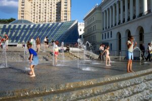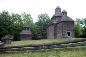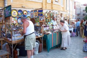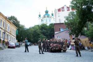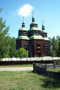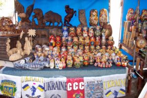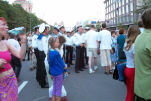 Today we decided to take a break from the city and head out towards the museum of folk architecture and rural life. We hailed down a cab and negotiated our fare to Pirogovo. Once there, we wandered the 150 hectare grounds and peeked inside centuries-old homes. These wooden structures have been collected from various regions throughout Ukraine and most of them are original (some have been reconstructed). There were plenty of folk costumes, fabrics, embroidery, carpets, ceramics, metalwork, wood, glassware, musical instruments, paintings, and household articles on display. The museum is in a serene setting and we spent hours admiring different regional structures. Lunch consisted of lamb and chicken shashlik grilled at a traditional Ukrainian restaurant and served up with a wild berry dip…absolutely delicious! After exploring the open air museum grounds to our hearts content, we hopped a cab back into the city where we were pleased to find that a festival was going on along Kreschatik Street. This broad street stretches along the administrative parts of the city for over a kilometer and it was full of thousands of pedestrians, strutting their best stuff as if they were on a catwalk. A band was playing and the crowd was ecstatically waving Ukrainian flags and singing/dancing along. We were so caught up in the atmosphere we wanted to buy Ukrainian flags and learn the motherland song but we settled for joining the crowd drinking in the streets. Ukrainian pride was oozing everywhere and it was awesome to experience the positive vibes flowing through the crowd.