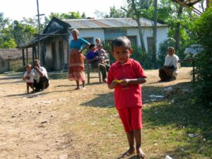 A happy Tharu boy smiles at the influx of visitors to his village; near Chitwan National Park
