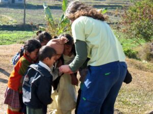 The children of this Tharu village are well behaved, queuing up for a distribution of school supplies