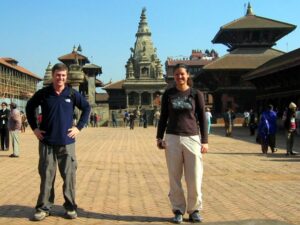 Day 13: The morning began with the whole group disputing the unexplained flight change. We insisted on paying Gulf Air’s local office a visit to find out the reason for the sudden change, so we delayed sight seeing for an hour. Richard educated the group that Gulf Air was trying to get out of compulsory compensation for overbooking our flight by “bumping” us off our originally scheduled flight. We all became extremely irate as we never got a straight story on our flight. We were basically told that there was a “technical” problem and we were rebooked on a flight the next day. We requested that they do what they could to change our flight back and give us the results in the evening. Trying to get the flight issue out of our minds, we visited the most important Hindu temple in the Kathmandu valley at Pashupatinath and one of the largest Buddhist Stupas in the world at Bodnath. Our Kathmandu tour guide was the best local guide yet. On the bus we sat mesmerized by her details of local customs and daily life in her family’s home. After the tour, we convinced the group that for the best pizza in Kathmandu, we should dine at Fire and Ice Restaurant, which did not disappoint. After lunch, we split from the group and spent the remainder of the day exploring Kathmandu’s Durbar square & freak street. We met up with the group in the evening for bowling. Barry kicked our butts at bowling with Sara taking a high score for the ladies. Afterwards, we decided on a late night dinner at the only Irish Pub in town.