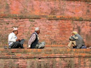 An elderly Nepalese man smokes a wooden hookah; Patan