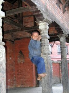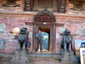 A boy straddles the entrance way to one of Bhaktapur's numerous temples