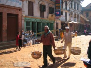 A Nepalese vendor wanders through Patan Durbar Square in search of a place to sell his goods