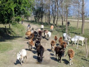 Day 9: The day’s itinerary included an early morning elephant ride to view more wildlife, a dugout canoe ride to the a Gharial crocodile breeding farm, an afternoon walk through the local village, a lecture on elephant life at Chitwan (thankfully a lot more humane than those at Amber Palace), and a nature walk though Chitwan park just before sunset. In the evening we were fed well with a buffet from the lodge restaurant, which offered the best food on the tour. After dinner, Pauline gave lessons on reflexology, while Raj benefited from everyone’s tutelage. Unfortunately, we missed the lesson but begged Pauline to offer a repeat lesson before the end of the tour.