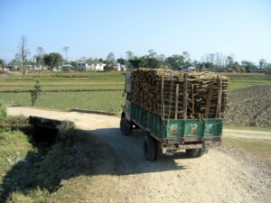 Wooden logs packed tightly on the back of this truck; near Chitwan