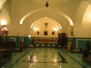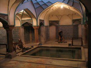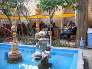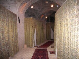 Today we piled into the car and watched as Mansour dodged in and out of traffic to get us to Kerman in record time. What was supposed to take 6 hours was pared down to just over 3 hours. Since we arrived earlier than expected, we had time to visit the Ganjali Khan bath and the Bazar-e Vakil. The Ganjali bath was a pretty neat museum, decorated with frescoes and tile work. Inside the “museum”, wax figures depicted what a traditional bathhouse would have looked like hundreds of years ago. After that, we visited the Chaykhaneh-ye Vakil, touted as the best subterranean teahouse in Kerman. The atmosphere was really nice and we spent hours smoking double apple tobacco through our water pipes. The local Iranian boys were really nice and even though they didn’t speak much English and we spoke no Farsi, we still were able to communicate with body language and our digital camera.