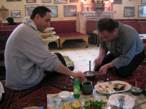 Hours later, we stumbled through the Bazar with Amin keeping a hawk’s eye out on us. He had regaled us with tales of kidnapping and opium smuggling and was paranoid to let us out of his sight. Duly guarded, we made our way back to our hotel and celebrated our second anniversary together with Amin and Mansour. For the first time on the trip, they witnessed Becky without her head covered and in regular jeans and t-shirt (inside the hotel room, the dress code is less restrictive).