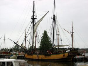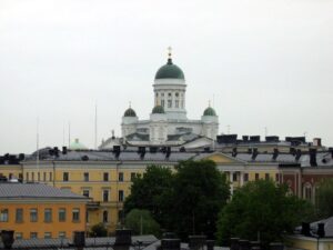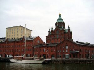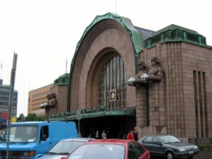 There are several ferries that cover the short distance between Tallinn and Helsinki, so we decided to capitalize on the opportunity. We were already based out of Tallinn and wanted to spend a whirlwind day visiting Finland’s capital city in June 2004. We woke up early in the morning to experience Hotel Olympia’s renowned breakfast buffet and chowed down quickly before deciding that the distance on the map from the hotel to the harbor looked close enough to hoof it…and subsequently ended up sprinting the distance to catch the 0800 ferry to Helsinki. We made it to the ticket booth with minutes to spare but the Estonian border guards took their time examining all of Becky’s passport stamps and visas before reluctantly allowing her to board the vessel. Once we crossed the plank, the crew literally sealed the doors right behind us and the ferry took off a minute after schedule. Thankfully, 0800 is too early for most travelers and the ferry was quite empty. We were able to snooze fitfully for the short 90 minute trip to Helsinki and when we awoke, were dismayed to see torrents of rain pouring down upon Helsinki harbor. Thankfully we came armed with rain jackets and umbrella so we bravely made our way out into the dismal weather.