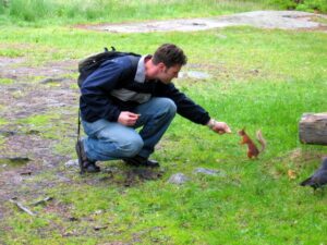 The open air museum is situated approximately 4 km outside of the city and is located on a peninsula. The Finns had the foresight over 100 years ago to preserve their historic buildings and the site was selected in early 1900s. It has since grown from a handful of buildings to several dozen wooden buildings representing all four corners of Finland. In each building, a young Finn in traditional costume patiently (and sometimes over-enthusiastically) explained the intricacies of the house, going over the history of when it was built, who lived there, the building’s function, etc. There were not too many visitors venturing out today because of the constant cold drizzle so the young men and women we met were more than happy to chat away to pass the time. Highlights from the open air museum included the church as well as the freakishly tame red squirrels. While we were strolling through the picturesque grounds, squirrels would approach us and pose with outstretched arms for food. It was uncanny how tame the squirrels are…if you stop walking and pretend you have food, they will clamber all over you in an effort to be fed. Becky felt a bit weird having squirrels jump all over her and eat from her hands but Robby had no problem trying to get the squirrels to do “tricks” such as back flips before feeding them. The squirrels are amazingly well behaved and will not grab food from your hands unless you willingly offer it. And believe it or not, they know not to bite fingers or skin but patiently nibble food held between one’s fingers…we kept expecting them to grab the food and run away but they seemed to enjoy being finger fed by humans…obviously they are used to hoards of tourists augmenting their diets with non-traditional foods such as cheese, chips or peanuts! After feeding the wildlife, we were building up an appetite of our own so we made our way back into town and decided to go budget with Chinese food. Is there any such thing as “budget” in Scandinavia? We don’t think so. Each basic dish cost about 18 Euro ($20) and our no-frills lunch came out to a whopping 45 Euros! We sure missed Tallinn’s prices after seeing that bill.