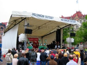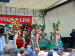 After lunch, we decided to hop on/off on the city’s circular tram tour (3T/3B) which visits most of the major Helsinki sights and is an economical way to explore the city. Combining a dry, warm heated tram to escape the cold wet drizzle after eating a nice meal spelt disaster and in no time at all, both of us were snoozing on the tram. Our conductor decided to wake us up after we were the last two passengers on his tram and suggested we catch a city bus to the main train station where a “Brazilian Dance Fest” was ongoing….he even suggested we participate in the dancing in a surefire way to rid us of our sleepiness. Once there, we were expecting to see Brazilians dancing but it instead were treated to 6 foot tall blond girls wearing tiny thongs and feather/sequin costumes while trying to dance to the samba…not for a lack of effort but the rhythm just wasn’t there and it was a funny spectacle to behold. Nevertheless, we enjoyed the show and no, we did not join in onstage but hid among the masses swaying to the beat below stage. We stayed until it was time for us to catch our return ferry to Tallinn. Our very very short impression of Finland is that we want to come back when the Finns are in their element (covered with snow) so we could hire dogs for a sleigh ride through the woods and well as experience sauna culture. Guess it will have to wait till next time…