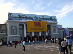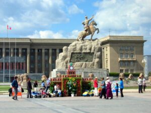 Alex quickly breaks the news to us that our itinerary has changed. While we had anticipated flying to the Gobi desert in about a week and were aware of the 10 kg luggage restriction on the hopper flight, we had fully expected to consume the 6 bottles of alcohol we had lugged on the tour before then. However, when Alex briefed us that the flight would be tomorrow at 0700, with an early 0400 wake up call, it didn’t really register…was she for real? How on earth would our luggage miraculously weigh 10 kg overnight? We didn’t want to leave our precious beverages behind, yet we had to ensure we brought adequate clothing to deal with Mongolia’s extreme climates. After the itinerary briefing, our group split off into several factions: those who wanted to visit UB’s Natural History Museum, those who wanted to sleep, or those who simply wanted to get away from the group to do their own thing. We opted for the guided tour of the museum and met our Mongolian tour guide, Temuujin (Genghis Khan’s original moniker). Saying Temuujin is a mouthful so he encouraged us to call him Tim for short. We started off at Sukhbaatar Square, the main square in the heart of UB.