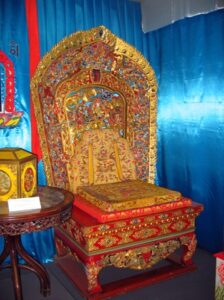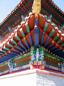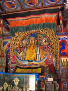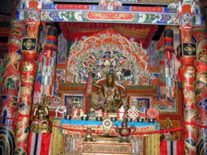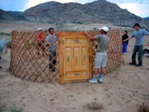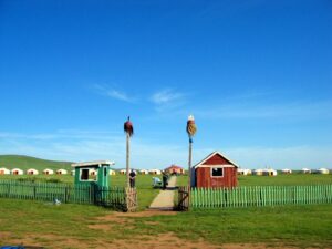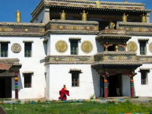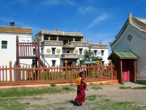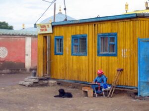 Our rally point was beside Damdiny Sukhbaatar, the Mongolian patriot portrayed astride a galloping horse. He is beloved by his countrymen for being the “hero of the revolution” because he declared Mongolia’s independence from China in 1921. The square has always functioned as a popular rally point for UB’s locals and is most associated with the scenes of 1989 protests that eventually led to the demise of communism. The square actually is very non-descript, and is flanked on all sides by important buildings such as the grey State Parliament house, stock exchange, Drama Theater and the tall, modern cultural palace. Tim gives us a brief introduction to UB but is very soft spoken and we have to strain to hear him. We learn that UB is dominated by communist style high-rise apartment buildings. However, to our surprise, approximately a quarter of a million Mongolians live in the extended ger suburbs on the outskirts of town, making the UB area the most heavily populated in the country. The gers are a popular abode since they protect their inhabitants from the wind, which can be brutal during the extended winter months. Even in the cities, most Mongolians continue to live in a ger, a large white felt tent that can be moved easily and has a universal layout. The door always faces south, towards the back of the ger, the Khoimor, is the place for elders and the most treasured possessions; on the back wall is the family altar, with Buddhist images, family photos and suitcases. The ger camps in Mongolia consist of several canvas and felt tents plus a large dining tent. Each ger used on this tour has 2 beds, a stove, bedding, plus a simple chest and coat rack for clothing. All are hand painted in local style.
