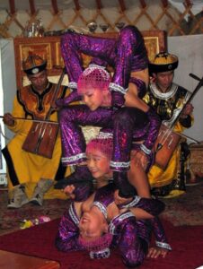 Tonight, Alex had arranged for a group dinner in downtown UB at a circa 1918 red temple that has been transformed into a ger-restaurant. Meals in Mongolia, as we would quickly discover, are always served in the following order: a salad appetizer, main meal consisting of meat and rice, and lastly, tea and dessert. Our group meal at the ger-restaurant was a real treat since Alex had phoned ahead and coordinated to have some local musicians perform for us. With very little fan fare, the musicians arranged themselves and their musical instruments just inside the main entrance of the ger. It was a really nice treat to have ancient Mongolian instruments performed for us, with the performers dressed in traditional Mongolian garb. One of the most melodic instruments was the horse head fiddle, which is shaped as a trapezoidal box that is connected to two strings of horsehair and played with a bow made from horsehair. The best surprise of the evening was when a trio of girl gymnasts (aged 12, 10 and 9) showed up and performed some unbelievable acrobatic stunts for us. Who knew the human body could contort itself into so many amazing positions? We eagerly snapped away with our cameras and marveled at how synchronized the tiny gymnasts were.