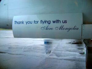 While we all had excess baggage and were painfully over our weight limit, we figured we would come up with a plan. The airport was a brief 15 ride away and we were able to snooze a bit longer while it was still dark out. Upon arrival at the airport, we were all in a state of disarray as we were shuffled from one check in counter to another. Once we arrived to the right check in counter, Bob was first up at bat to face the unsmiling and non-negotiable check in clerks. He was informed that the baggage limit was now 15 kg (good news) but that also included all carry on baggage (bad news). So, while under the gun and in the spotlight, Bob’s quick thinking saved us all a ton of money. He simply grabbed Lisa’s handbag (yes, a ladies purse) as well as a half empty plastic bag and claimed them as his “carry on” baggage, receiving a startled glance from the attendant (maybe Air Mongolia has a “don’t ask, don’t tell” policy) as well as on-board luggage tags from Air Mongolia. Of course, his real carry on bags were hidden from view and remained un-weighed, as they would definitely put him over the 15 kg limit. Armed with the luggage tags, he simply placed them on his heavy baggage and handed the plastic bag and Lisa’s purse to virtually every member of our tour group. And so, the hero of the moment was Bob since we were all able to escape paying excess baggage charges thanks to his spur-of-the-moment, spontaneous scam. What was weird was that the check in clerk didn’t catch on to the fact that she had seen Lisa’s handbag passed along to each member of the tour group, with everyone claiming, “Yes, we packed this ourselves”. Leave it to Bob to outscam the locals!