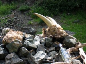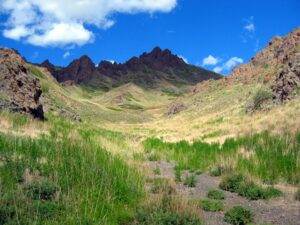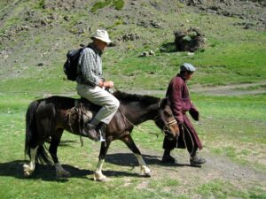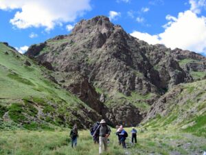 About 2 km into the hike, the riders dismounted and joined the rest of our group for a leisurely walk through the valley. Marmots scurried away as we walked past and several eagles soared magnificently overhead. Our hike intersected a rambling brook several times and we had to hop over to the other side using partially submerged (wet) rocks. Unfortunately, Ushee bit it on one of those crossings and her face made full contact with the ground. We attempted to stop the flow of blood and recommended that she apply pressure to her nose and forehead. Later on we would kid her about her Vulture valley inflicted “war wound” but she was a true trooper and continued hopping over the river crossings with gusto.