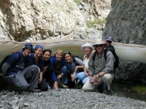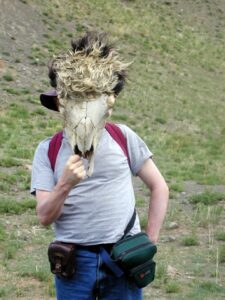A few kilometers into our hike, we reached a segment that remained icy, despite the warm summer temperatures. All of us made our way here with caution, as the path was very slippery. Since the area was so photogenic, an icy arch begged to serve as the background for a Clark Clan photo. The hike through the valley was exhilarating and we were enjoying the phenomenal views that lay before us. After a few hours, we stopped for lunch in an open meadow and soaked in some sunshine. Nancy, Ann (both of them) and Lisa were budding botanists so after lunch, they admired the surrounding plant life and spouted off the scientific names for many of them. The Gobi desert is sure full of surprises, and the bountiful plant life is one of them! After lunch, we had a short hike up to our awaiting ride. Along the way, John found an intact skull of a cow or horse and posed behind it, much to our amusement. We trudged up one last hill and took a breather beside the bus, happy to have spent our morning hiking through such a beautiful part of Mongolia.