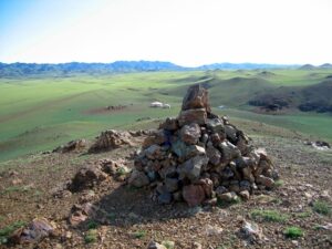 The weather took a turn for the worse and we had to don our jackets and rain gear. We made a brief stop at a “highway” rest stop where we stocked up on the shop’s entire supply of chocolate bars, chips and juice. Next to the rest stop was an ovoo (abode of spirits), which is essentially a pile of stones found on top of hills and passes. The ovoo is an old and widespread custom throughout Mongolia and we were told to circle it three times in a clockwise direction, placing our own stones on the ovoo upon completion. After performing the ritual, we boarded the bus for the rest of the trek out to Jalman.